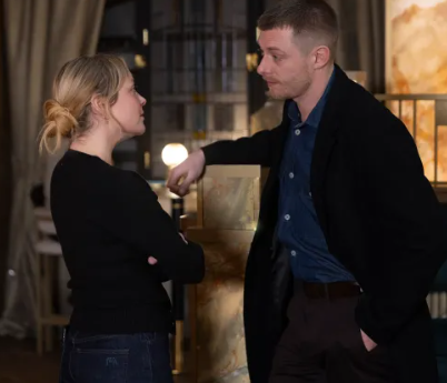 Megan Walsh looking at Daniel Osbourne as they talk in Coronation Street.